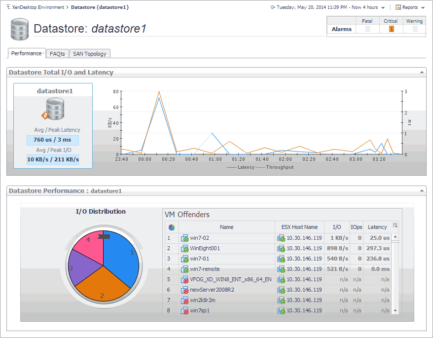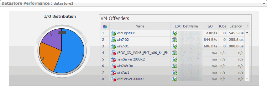 Identifies potential virtual machine offenders that consume the highest amounts of the selected datastore resources. It also displays a pie chart indicating how much the virtual machines associated with the selected datastore contribute to the overall I/O. For each identified virtual machine, it shows its name, the ESX® host on which it is running, the disk transfer rate, the rate of I/O operations per second, and the average time that passes between the time the virtual machine issues and executes disk read or write operations. |