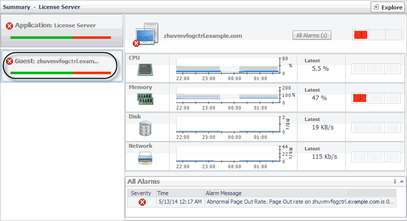 When you select the Guest tile, the view shows the usage of system resources on the machine on which the selected License Server or Controller is running. Use this view to see the trends in usage of the selected component’s system resources, and to review any generated alarms, if they exist. For example, high peaks in the memory utilization chart, that drastically exceed historical values could result in performance degradation and should be investigated.