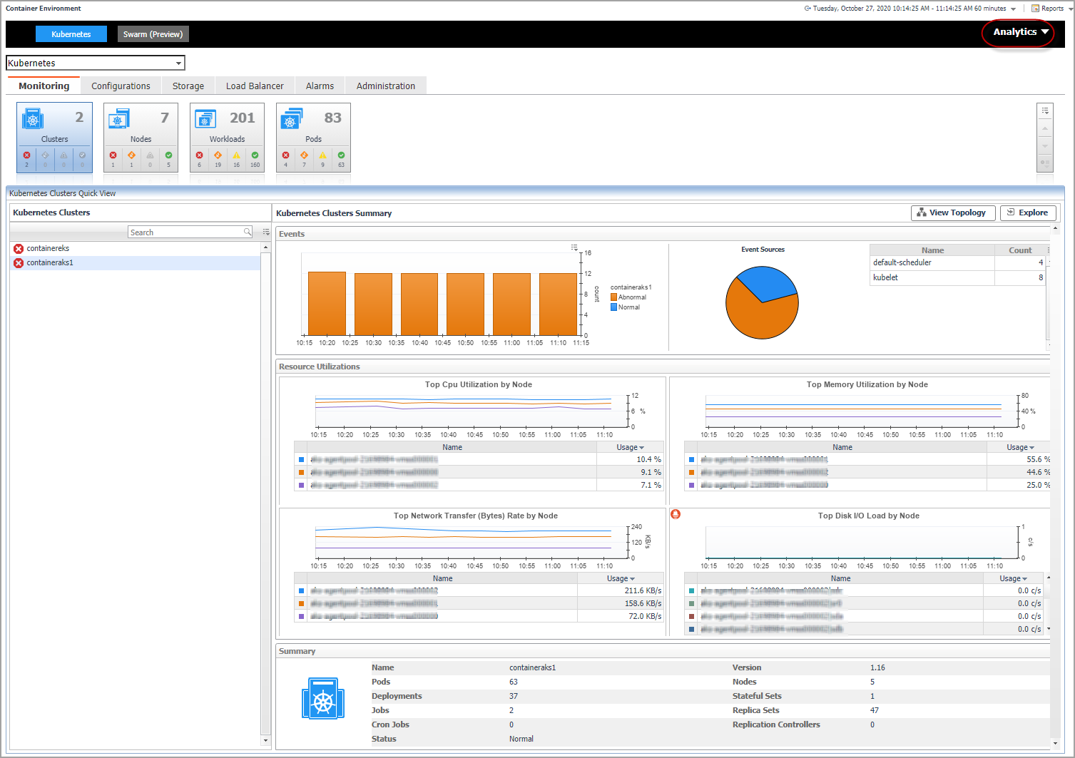 Foglight for Container Management provide analytics feature for Kubernetes and Docker Swarm.