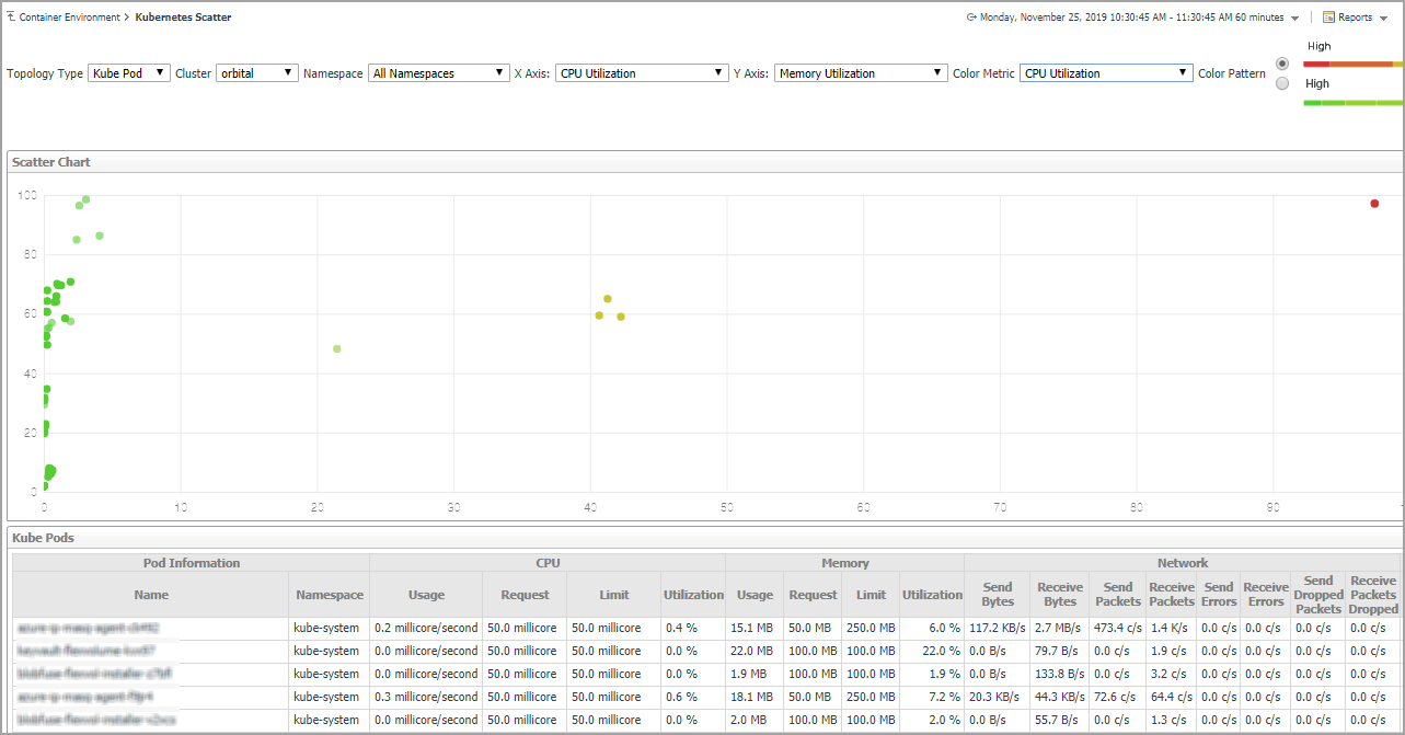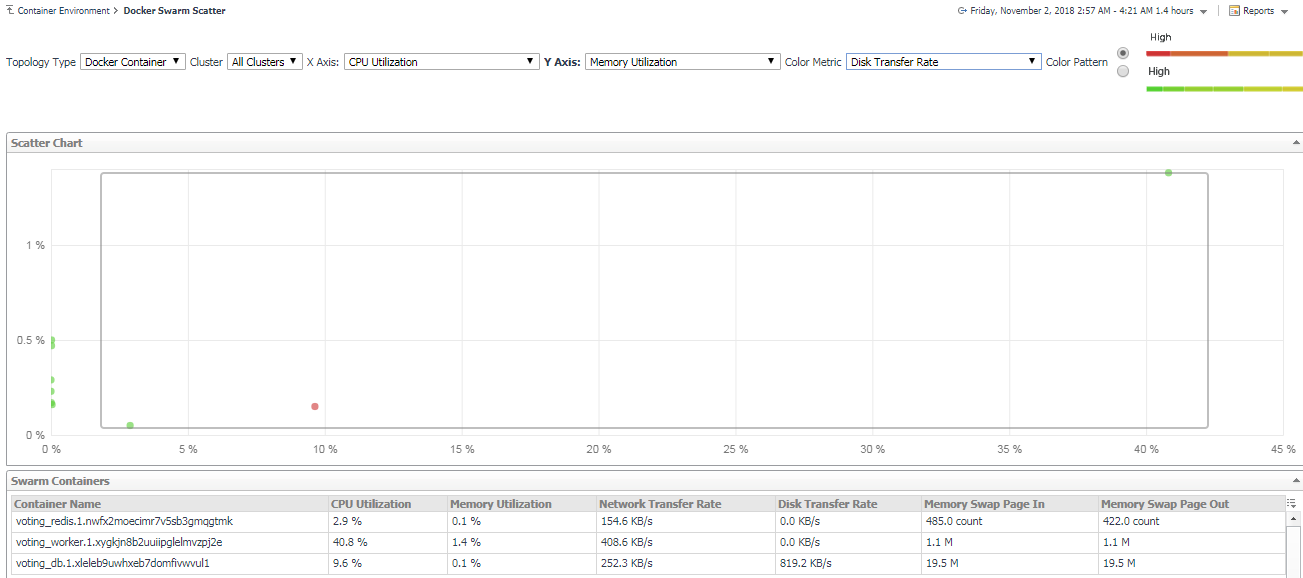 Figure 53 shows an example of Scatter Plot analytics. The purple circle in the middle represents the following: “voting_redis.1.nwfx2moecimr7v5sb3gmqgtmk” CPU Utilization is 2.9%, its Memory Usage is 0.1%, and its value of Network Transfer Bytes is not high. For more information, see: