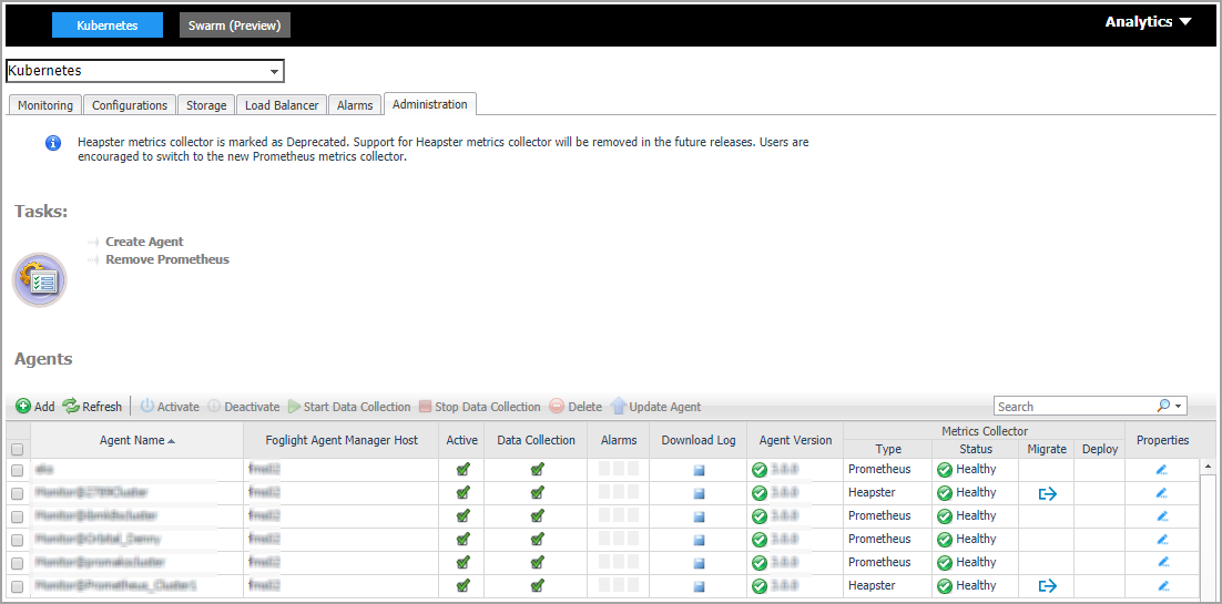 Use Create Agent or the Add button to start a wizard to create a new agent. See Creating and Activating a Kubernetes Agent for more information.