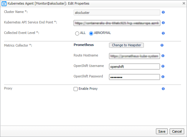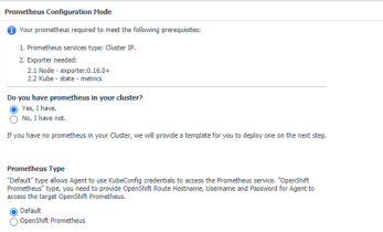 NOTE: If the Prometheus is deployed through our platform, the Service Namespace and Service Name cannot be updated through Kubernetes Agent Edit Properties wizard. You can use Remove Prometheus to remove Prometheus and deploy a new one. |
