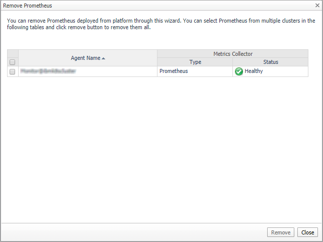 Remove Prometheus will start a wizard to remove the Prometheus successfully deployed through our platform.