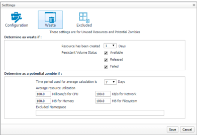 The Waste tab allows you to configure the settings for determining resources wasted in your environment. These include unused resources and potential zombie Pod controllers.