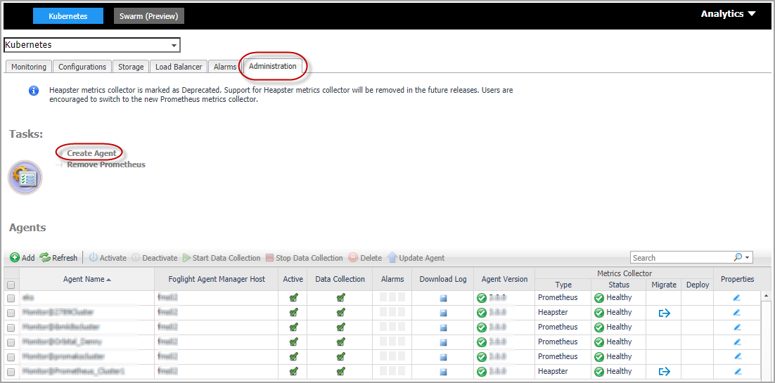 On the Agent Status dashboard, select the Kubernetes agent that you use to monitoring the container environment, and then click Edit Properties.