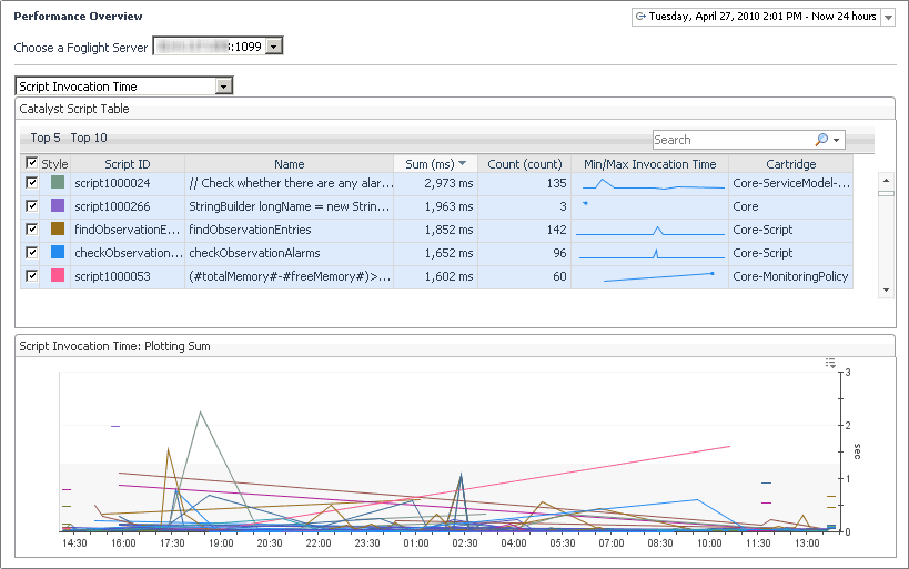 Contents of this view includes a drop down to select the host name. Here, you can select a Federation Master, Federation Child, or standalone server. To do that, click Choose a Foglight Server and select a host from the list that appears. It also contains the following embedded views:
