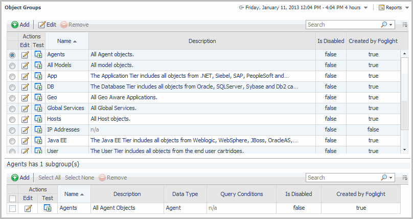 Foglight ships with a number of default object groups and subgroups. These groups are marked as Created by Foglight and cannot be changed or deleted.