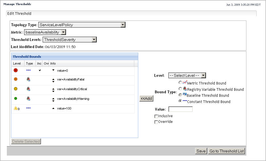 The Edit Threshold view shows the topology type and its metric property for which the threshold is defined, the selected threshold level, modification date, and threshold bounds. Each threshold level comes with a unique set of pre-defined bound levels. For example, the threshold level for the agent state includes the bound levels that correspond to different agent states, such as Stopped, Started, Running, and others.