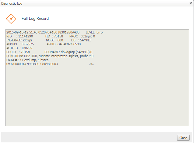 The Log drill-down provides a diagnostic graph and log of database log activity. Records displayed are those configured in the Diagnostic Log administration screen.