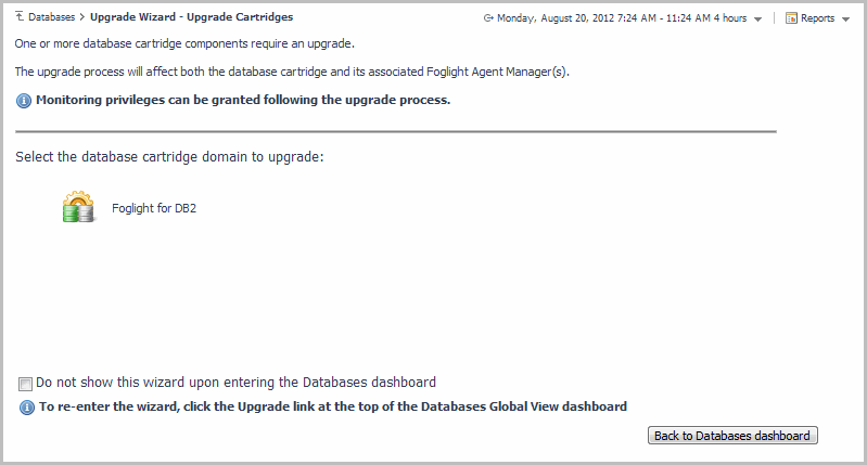Any upgrade of Foglight for DB2 LUW to the latest version, without upgrading the database cartridge components, is detected after the Databases dashboard is loaded. The upgrade is detected either automatically (by default: every 60 seconds) or manually, by clicking F5. Upon detecting the need for upgrade, the upgrade wizard starts automatically.