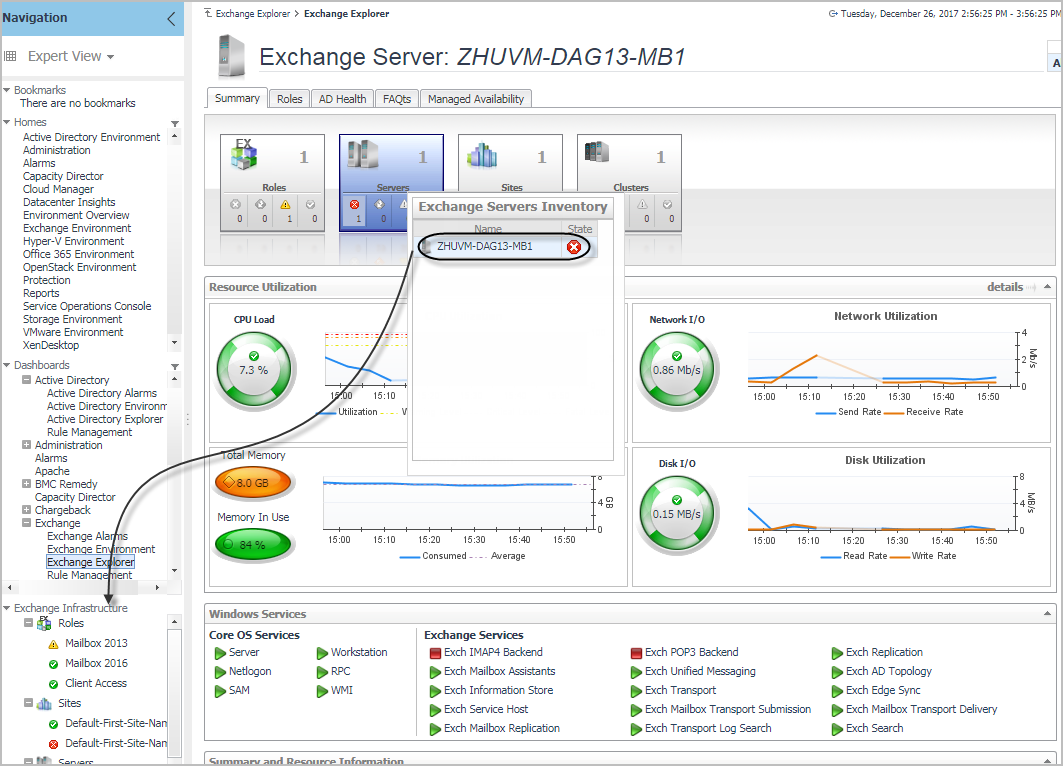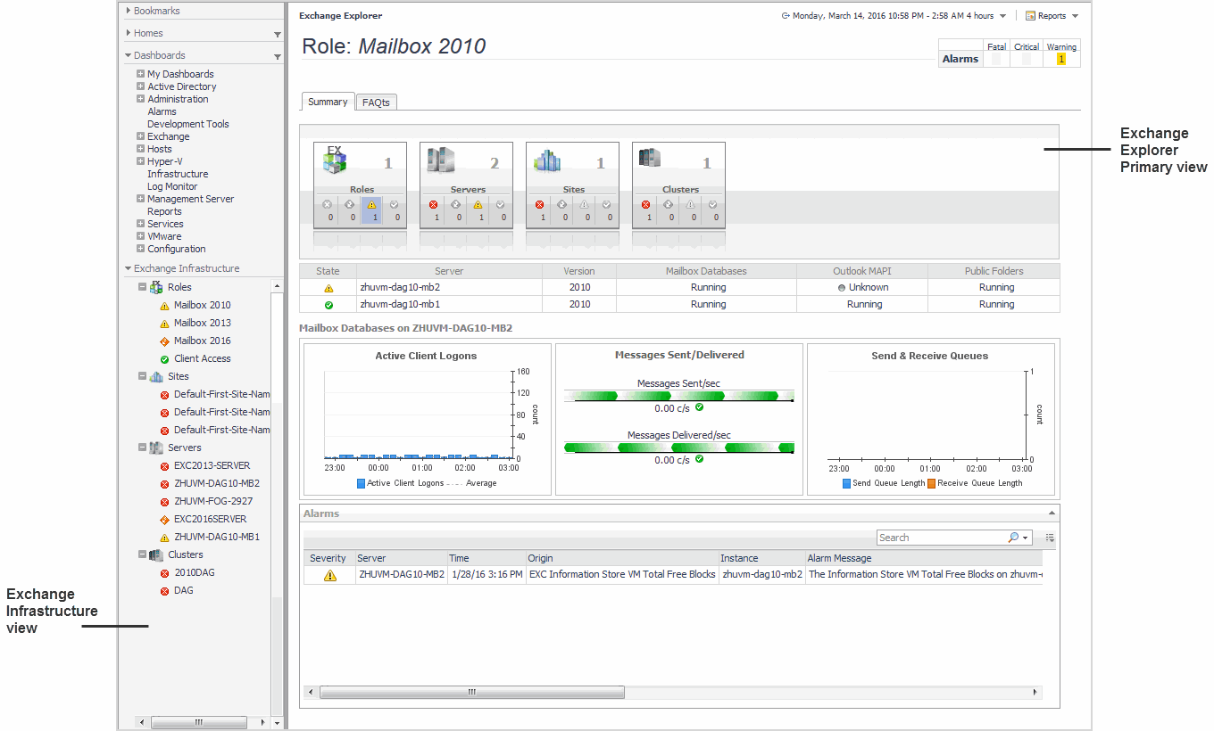 The Exchange Explorer dashboard has a hierarchal interface that you can use to view various performance metrics and alarms within your Exchange infrastructure. It provides informative views through which you can quickly and easily access detailed information about any of the objects in your Exchange environment.