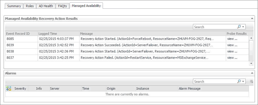 When an individual Exchange 2013 or 2016 server is selected in the Exchange Infrastructure view, the Managed Availability navigation tab appears. The Managed Availability process addresses availability and latency issues or errors by triggering applicable actions. These actions are displayed on the Managed Availability view.