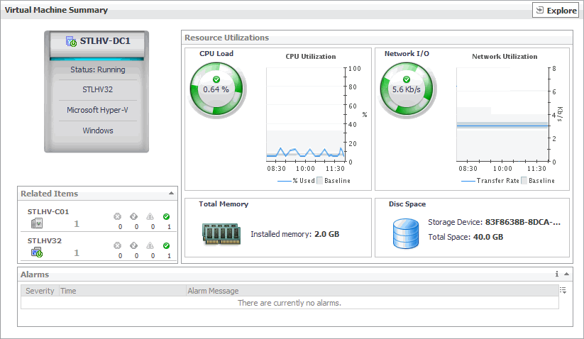 Server. The name of the server on which the selected virtual machine is running on, followed by the counts of all alarms associated with that server, broken down by the alarm state (Normal, Warning, Critical, Fatal).