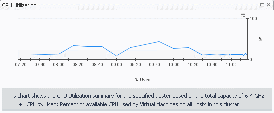 CPU Utilization, % Used. The percentage of the CPU utilization used by the servers that belong to the selected cluster to execute system code and user programs, during the selected time period.