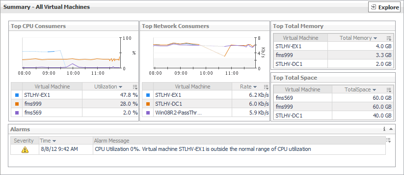 The Summary - All Virtual Machines view displays overall resource utilization information for a group of virtual machines and shows the elements that consume the highest amount of system resources.