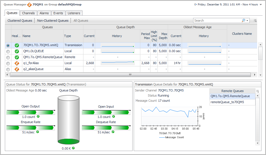 Use the Queues tab to view details about individual queues, clustered queues, or non-clustered queues. For example, to see the volume of the incoming data flow for a queue, select it on the
