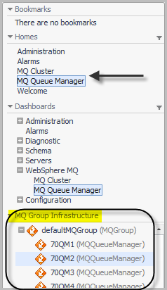 Listeners tabs list the alarms, events, and listeners associated with the selected queue manager. Use these views to quickly see the state of these entities.