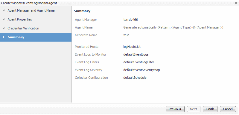 The Summary page reflects the newly configured settings, including agent properties. Because File Log Monitor and Windows Event Log Monitor agents each come with a different set of agent properties, the contents of this page are different, reflecting the type of the agent instance that you are creating.