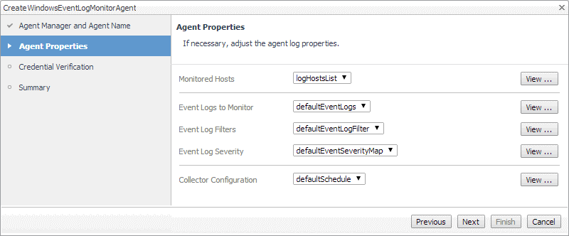 Next, configure the File Log Monitor and Windows Event Log Monitor agents for data collection. For more information, see Configuring monitoring agents, Configuring agent properties, and Configuring connections to remote Windows platforms.