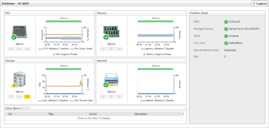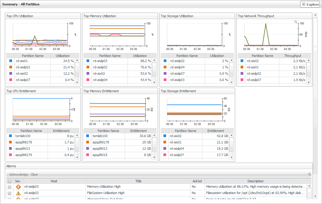 Use this view to review the trends in usage of the partition's system resources, and to review any generated alarms, if they exist. For example, high peaks in the processor usage chart could cause performance degradation and should be investigated.