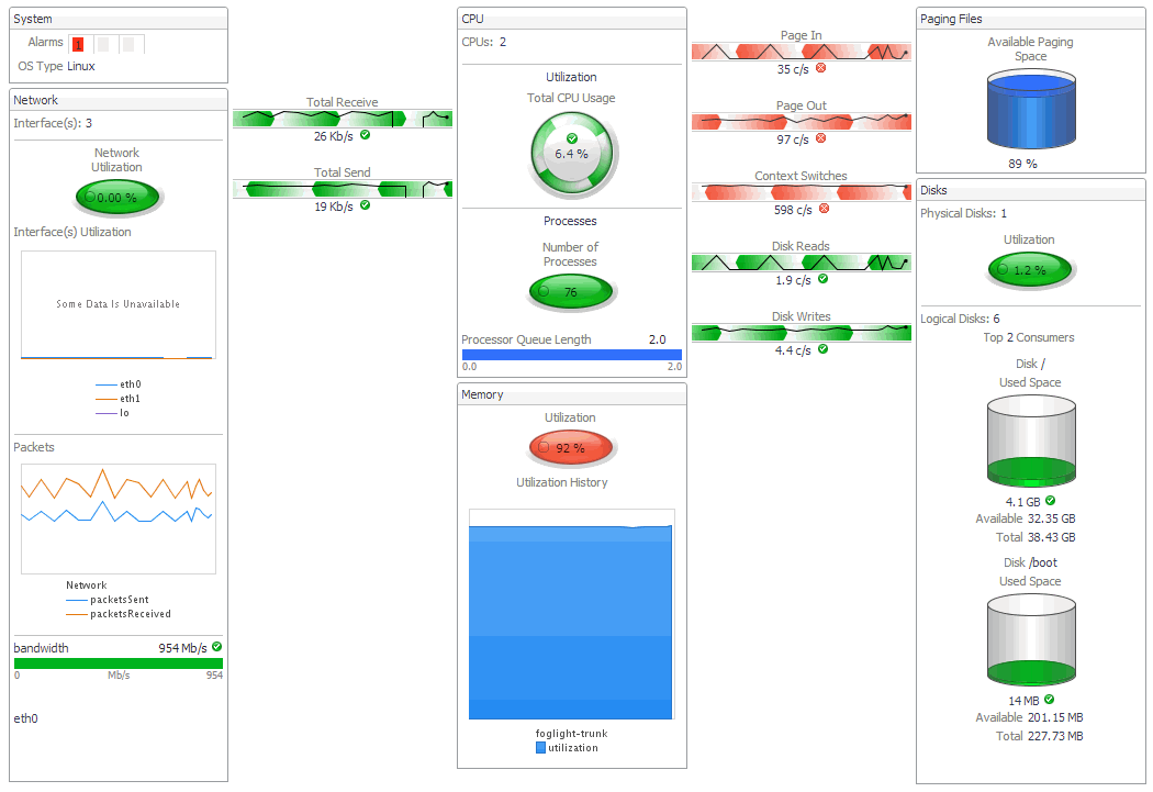 When you select a monitored host and display its resource utilization views in the Quick View, you can drill down to a detailed view to explore that host’s activity. For example, selecting a Windows® host and choosing Explore displays a monitoring dashboard that helps you understand the state of the host’s resources and how they affect your monitored system as a whole. Along with displaying the system, network, CPU, memory, disk usage metrics, and any related alarms, this intuitive dashboard connects these visual elements with a series of graphical flows that illustrate how quickly the hosts transmits and processes data in real time. For example, you can review the rates of incoming and outgoing data and how they affect your network resources.