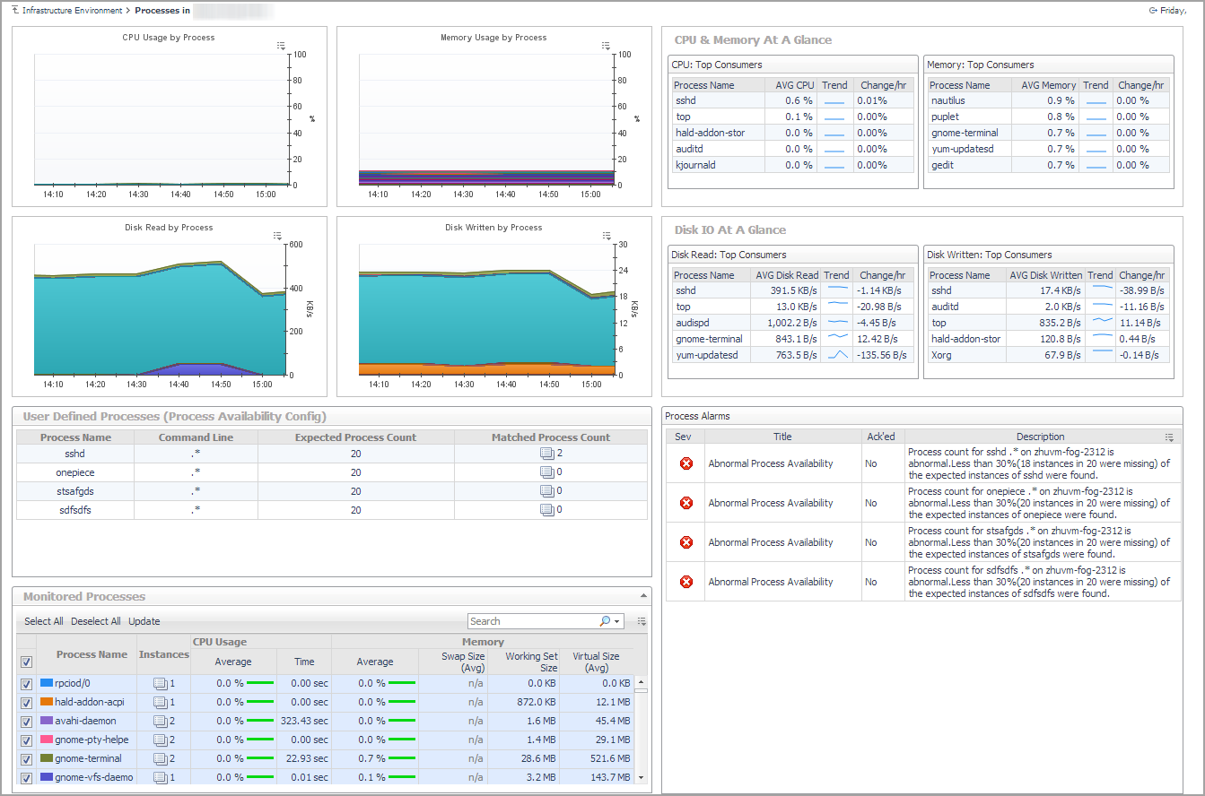From the CPU, Memory, and Disk views you can drill down into the Processes dashboard, by clicking the CPU Usage by Process, Memory Usage by Process, and Disk IO by Process links respectively. The Processes dashboard provides a summary of CPU, memory, and disk usage by process, as well as a table of process details. If a host does not have process data (for example, because it is monitored by a virtual agent which does not collect process data), then it is possible to create an agent to monitor processes directly from this drill-down view.
