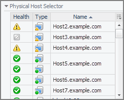 This dashboard also provides the Physical Host Selector on the navigation panel, which allows you to quickly drill down on a different host and investigate its state, without returning to the Quick View.