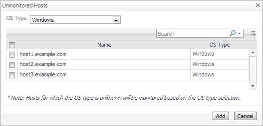 Start monitoring existing unmonitored hosts: Choose this option if you want to start monitoring one or more hosts that already exist in your environment, but are not currently monitored. On the Host List page, click Add Known Unmonitored Hosts. |
