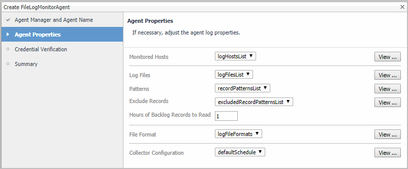 Next, configure the File Log Monitor and Windows Event Log Monitor agents for data collection. For more information, see Configuring monitoring agents, Configuring agent properties, and Configuring connections to remote Windows platforms.