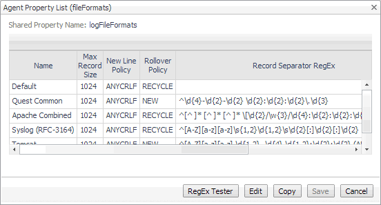 When an agent connects to Foglight, it is provided with sets of properties that it uses to configure its correct running state. The File Log Monitor and Windows Event Log Monitor agents are provided with list properties. List properties can be shared amongst multiple agent instances. Any changes you make to a list property affects all agent instances that are associated with that list.