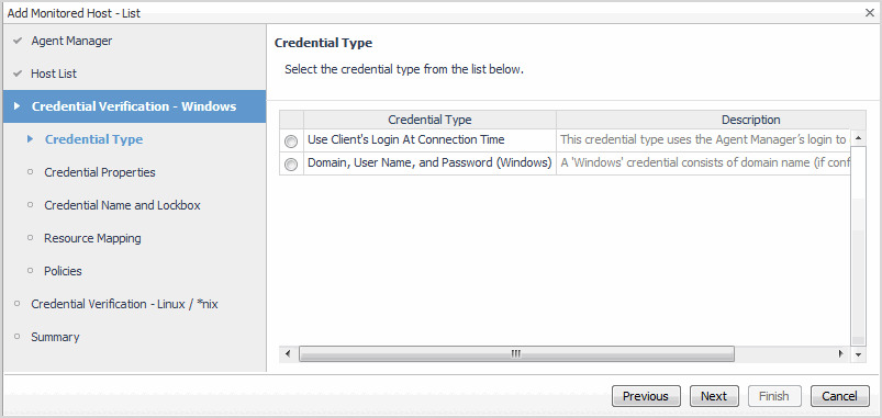 Add host(s) to an existing credential: Select this option if you want to add the host to an existing credential. This option is suitable if an existing credential has the security data needed to access the new host, but you need to edit its resource mappings to include this host. Click Next and continue with Step 6. |