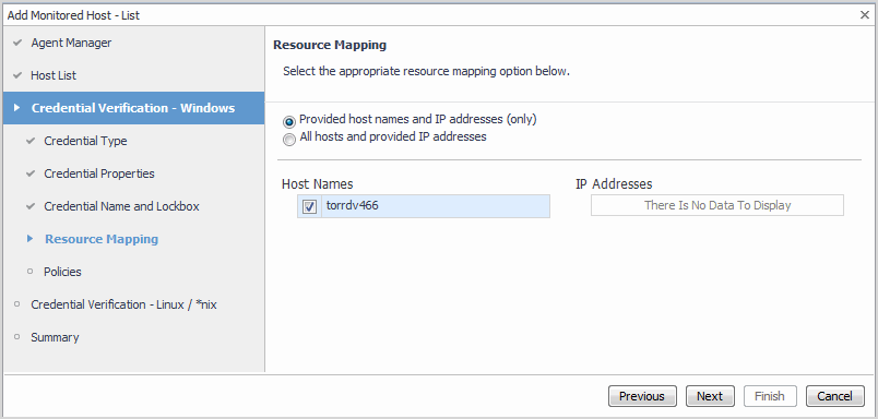 On the Resource Mapping page, indicate which hosts you want to associate with this credential. You can either select all hosts in the list, or all monitored hosts. |