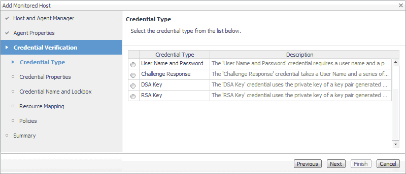 Do not configure a credential: Select this option if you want to configure the credential for this resource at a later time. Local credentials for Windows® and UNIX® are set up by default when Foglight for Infrastructure is installed. Click Next and continue with Step 7. |