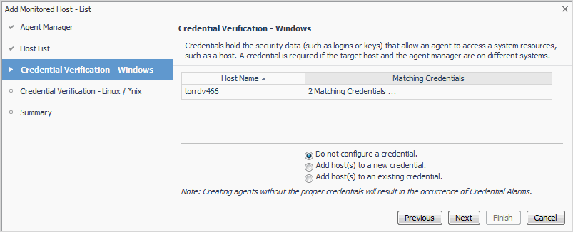 Do not configure a credential: Select this option if you want to configure the credential for these hosts at a later time. Local credentials for Windows® and UNIX® are set up by default when Foglight for Infrastructure is installed. Click Next. |