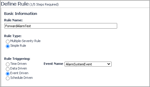 Click to select the Simple Rule option button and the Event Driven option button, then select AlarmSystemEvent from the Event Name drop down.