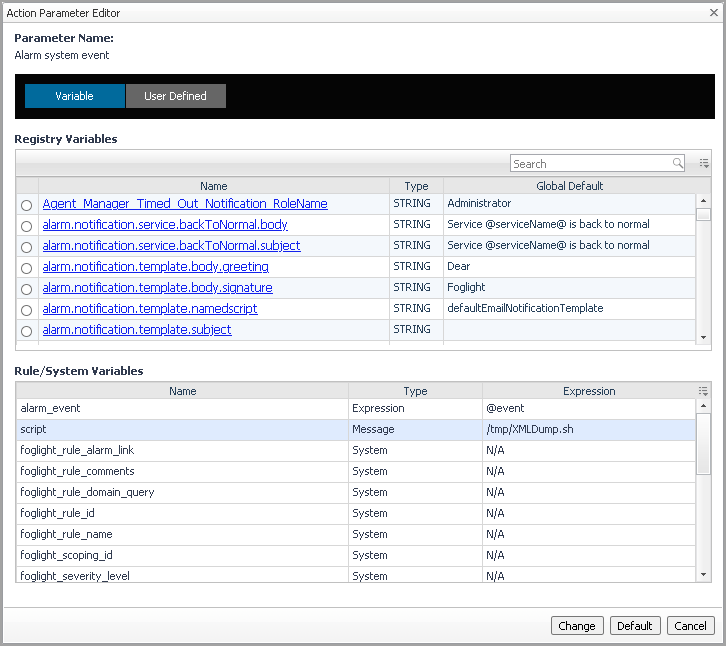 For COMMAND_LINE, click the Default link, select script from the Rule/System Variables and click Change.