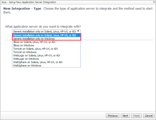 New Integration - Type: Select Generic installation only on Solaris, Linux, HP-UX, or AIX for Linux, or select Generic installation only on Windows for Windows.