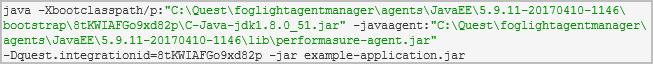 Windows: Assume the Java EE agent directory is “C:\Quest\foglightagentmanager\agents\JavaEE\5.9.11-20170410-1146”, the “QUEST_INTEGRATIONID” value is “8tKWIAFGo9xd82p”, and the target Spring Boot application jar is “example-application.jar”. Then update the original command to the following: