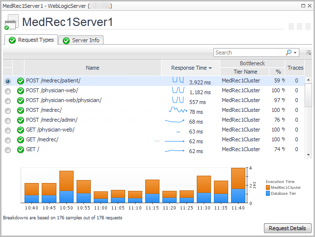The Request Types tab lists the following information for each request type: request name, response time, bottleneck location (based on the most time-consuming tier of a request), calls completed, calls incomplete, call exceptions, and number of traces.