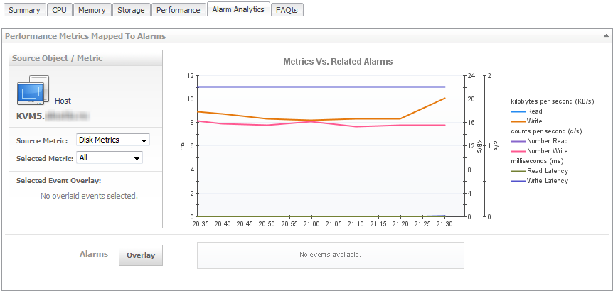 The Alarm Analytics tab displays resource-related metrics collected about a Host, Instance, or Volume over a selected time period, and also shows any events that occurred during that time frame.