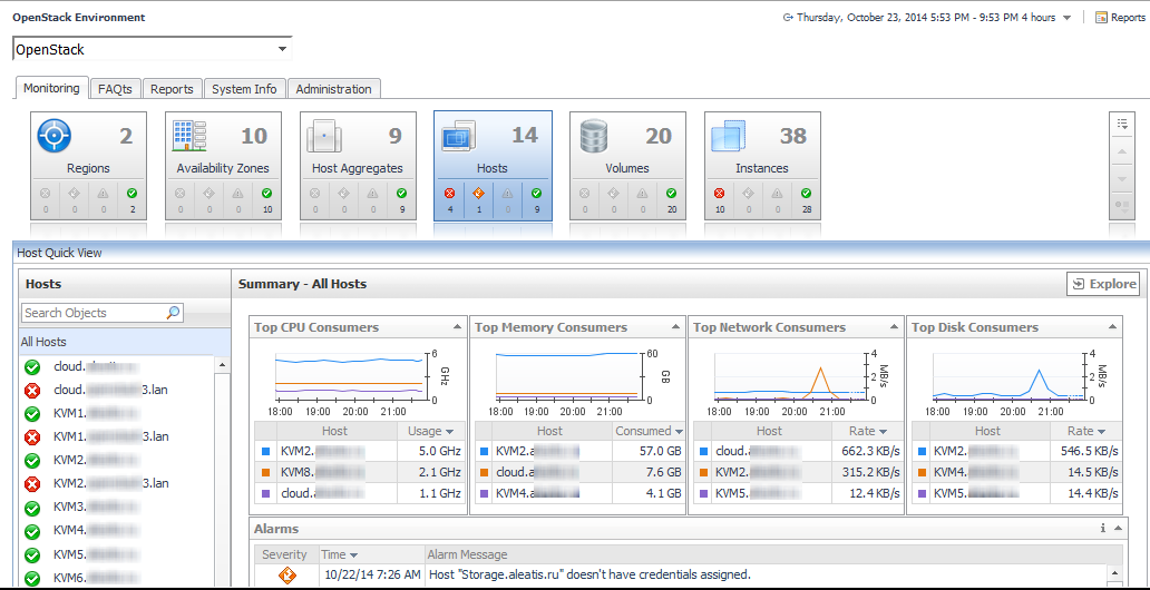 For each resource object type (Regions, Availability Zones, Host Aggregates, Hosts, Volumes, and Instances) the default view when clicking a tile is all objects, such as All Hosts. This view can be seen in the object list view in the left frame of the Quick View with top resource consumers in the group in the right frame.
