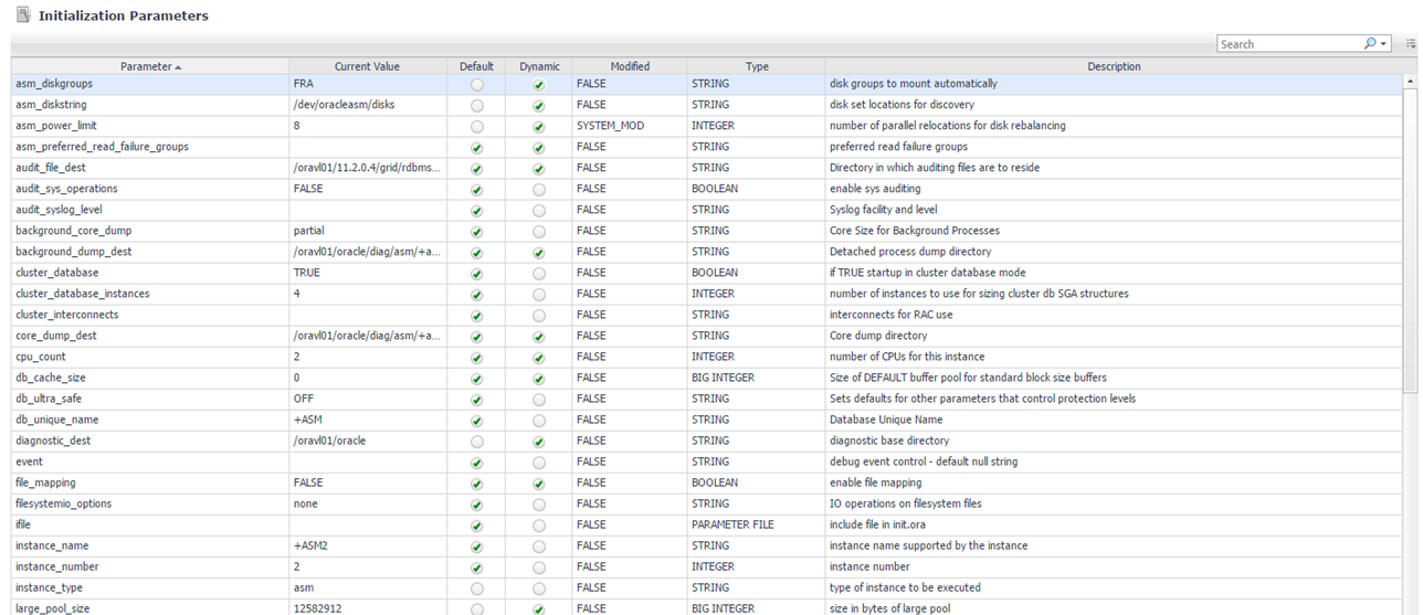 The Parameters tab displays a list of all the ASM parameters and their values, as well as some other additional information for each parameter.