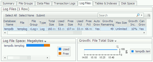 The Log File Growth chart shows the amount by which each log file is growing over time.