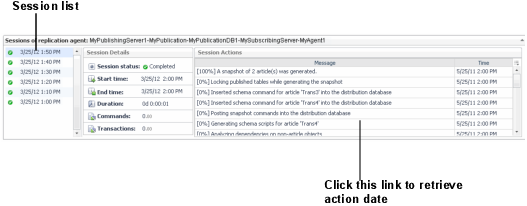 Publisher to Distributor — displays the session actions of the Snapshot or Log Reader agent.