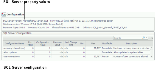 The Server Property Values panel contains information about the server properties of the monitored SQL Server instance.