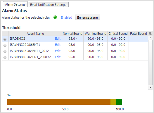 Click Enhance alarm. Select the check boxes for the severity levels you want enabled and set the threshold values. Click Set.