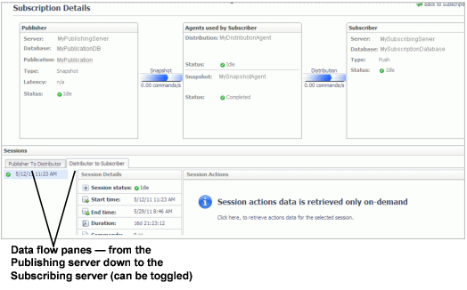Publisher to Distributor — displays the session actions of the Snapshot or Log Reader agent.