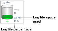 The disk icon represents the total percentage of currently used space within the entire capacity of all log files that reside on all databases. The total percentage is also displayed in text at the bottom of this section. In addition, this section displays the physical size of log files space used and the total number of log files.
