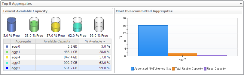 Most Overcommitted Aggregates. Identifies up to five of the most overcommitted aggregates, and displays current values for Advertised NASVolumes Size, Total Usable Capacity, and Used Capacity.