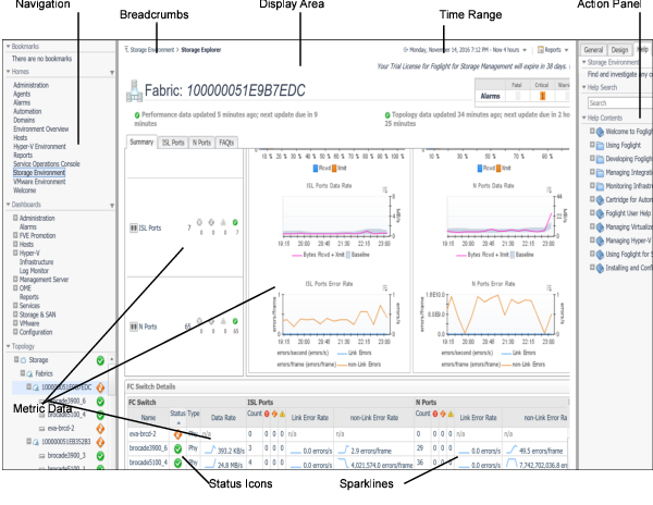 Foglight for Storage Management is built on the Foglight platform. The following diagram and table introduce the common Foglight for Storage Management screen elements that are used in Foglight for Storage Management dashboards. If you need more information about how to use these elements, open the online help and navigate to Foglight User Help > Getting Started > Working with Dashboards.